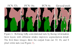 圖4. 通過融合來自具有不同跨度的圖層的信息來完善全卷積網路,可以改善分割細節。 前三個圖像顯示了我們 32、16 和 8 像素步幅網路的輸出(請參見圖3)。